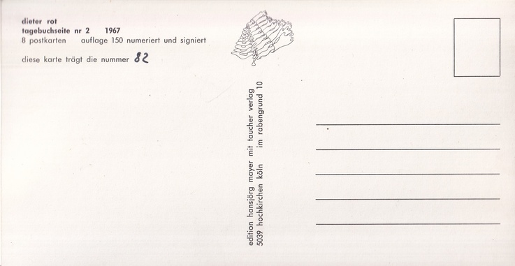 8 postkarten, 21 x 10,5 cm. fotomechanische reproduktion von 8 tagebuchseiten. flachdruck (offset), 4 farben auf weissem papier auf postkarten in plastikhülle ( je 4 karten in 2 hüllen), hier ohne etikett (fotokopie liegt bei). auflage: 150 hs. numerierte und signierte exemplare (je karte ident. num. und signiert). dies ist exemplar nummer 82. eine folie- wie üblich- leicht gewellt, sonst tadellos erhalten./// 8 diary pages 1967. 8 postcards (4 cards in 2 plastic cover), edition of 150, numbered and signed. one envelope (as usual) min. wavy otherwise mint condition..